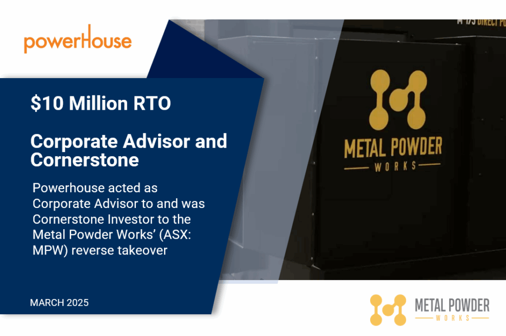 Powerhouse brought MPW to the ASX via a reverse takeover (RTO), acting as Corporate Advisor and Cornerstone Investor, resulting in a 22x return.